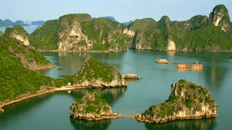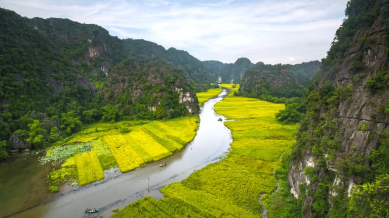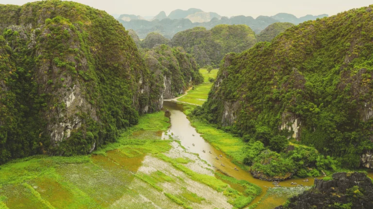 Step back in time at Hoa Lu, Vietnam’s first capital, where dynastic relics whisper of centuries past. Board a small sampan to glide through Tam Coc, with limestone cliffs rising majestically above tranquil waters. Climb to the Hang Mua viewpoint, where sweeping views of the valley reward your effort. Savor a rustic lunch of local specialties before returning to your boutique hotel.