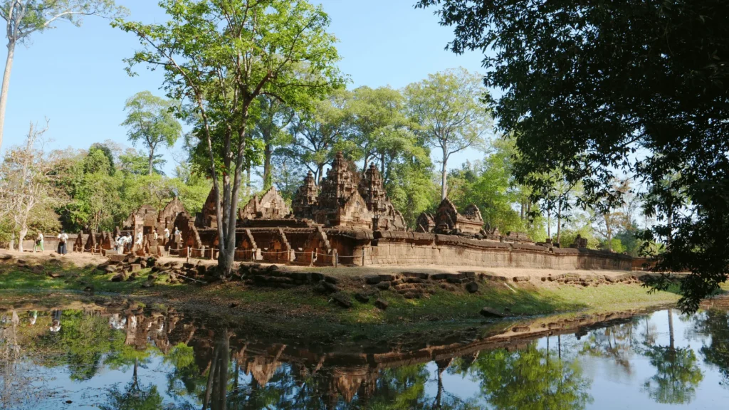 Located around 25 kilometers north of Angkor, Banteay Srei is a small yet intricately detailed temple dedicated to the Hindu god Shiva. Built in pink sandstone, this temple is renowned for its well-preserved carvings and decorative reliefs that depict Hindu mythology.